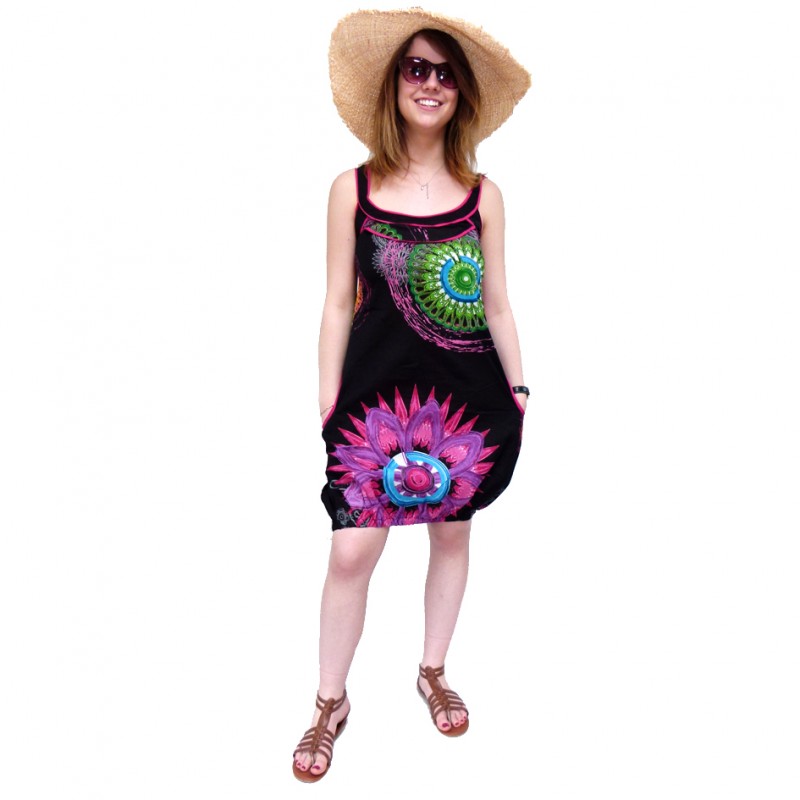 Super craquante cette Robe/tunique ethnique Widy noire et fushia 100% coton. 2 poches. Dos élastiqué et bretelles.