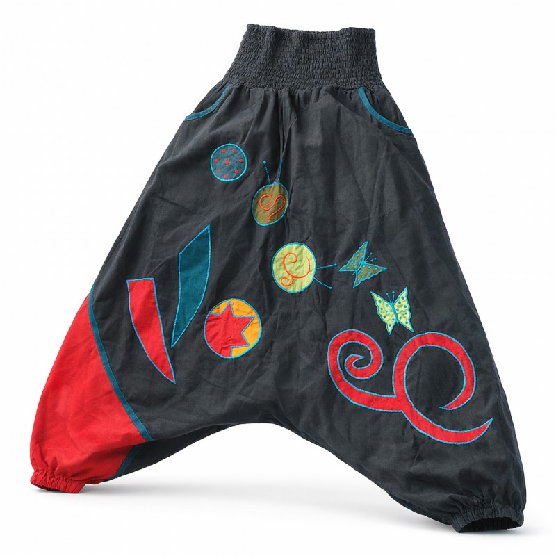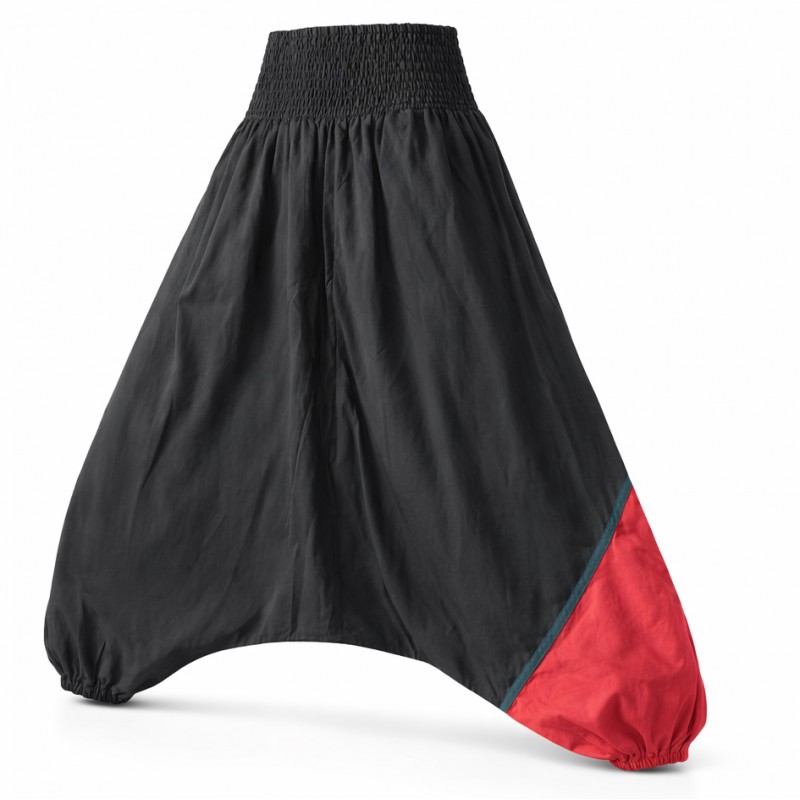 Grand confort avec ce sarouel ethnique noir et bleu large 100% coton. 2 poches principale, poches zippées sur les cuisses. ceinture élastique resserable.Chevilles élastiquées.